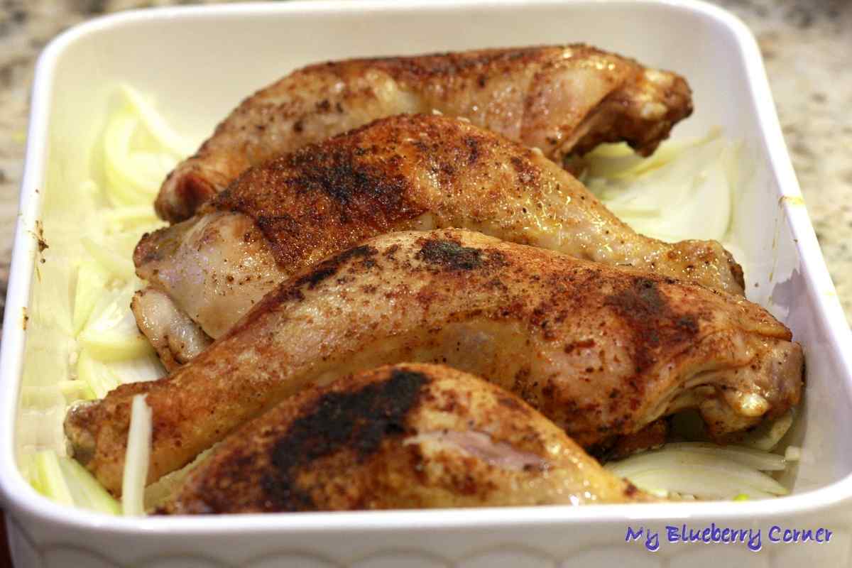 Piekarnik rozgrzać do temperatury 180°C. Nogi przyprawić solą, pieprzem i wędzoną papryką, smażyć na oleju, przez kilka minut, z obu stron do zrumienienia.