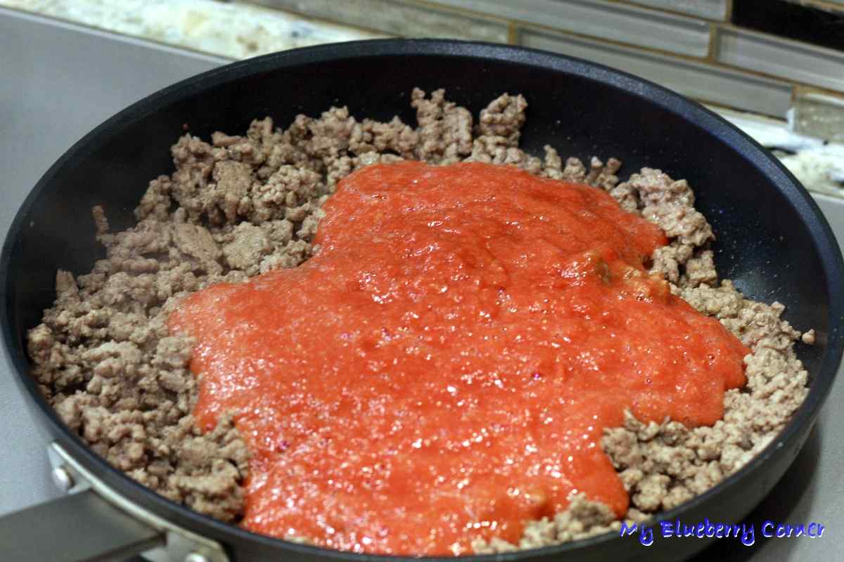 Dodać przeciśnięte przez palce (lub pokrojone) pomidory ze słoika.