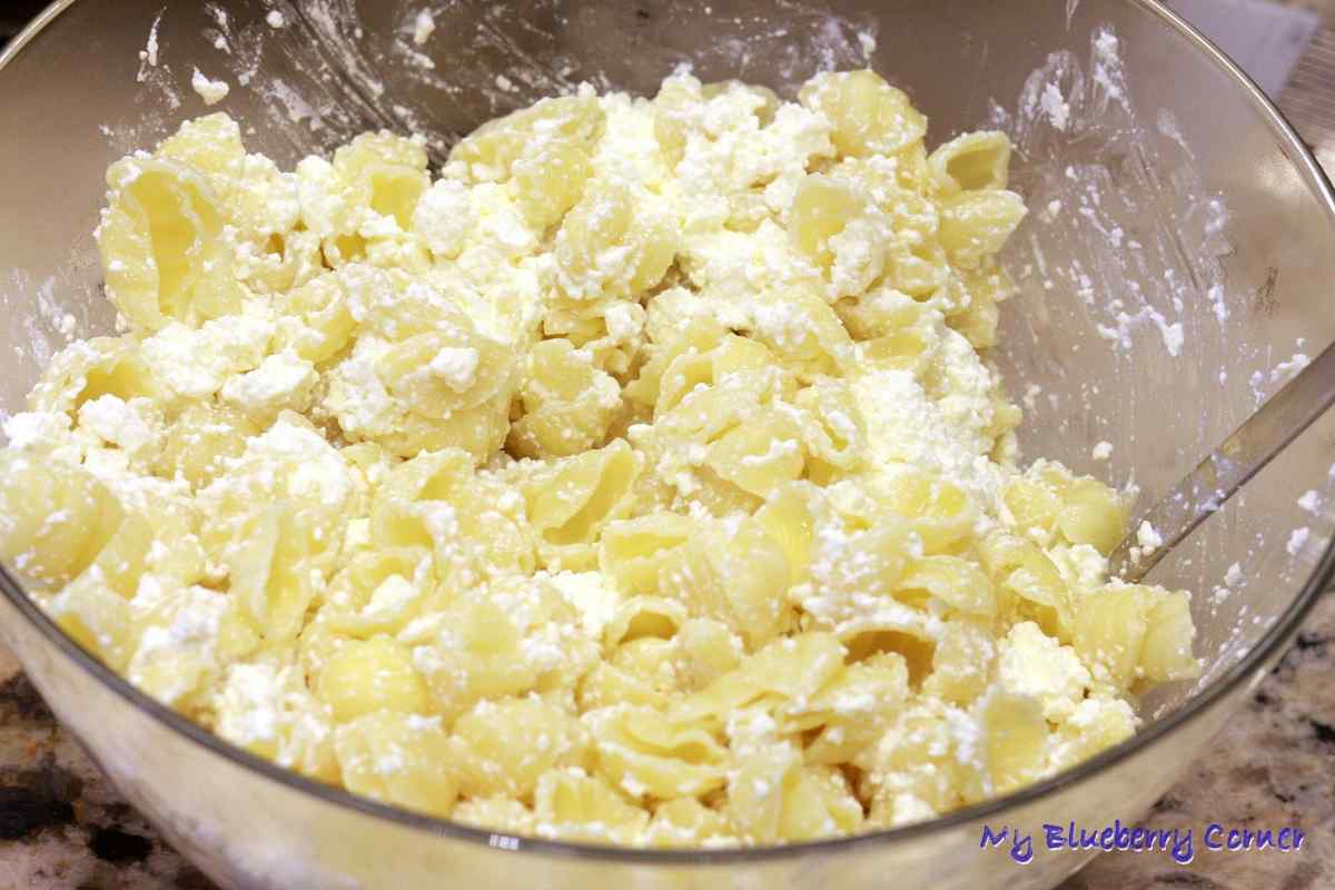 Po ugotowaniu, odcedzony makaron przełożyć do miski ze śmietaną i serem, razem wymieszać.