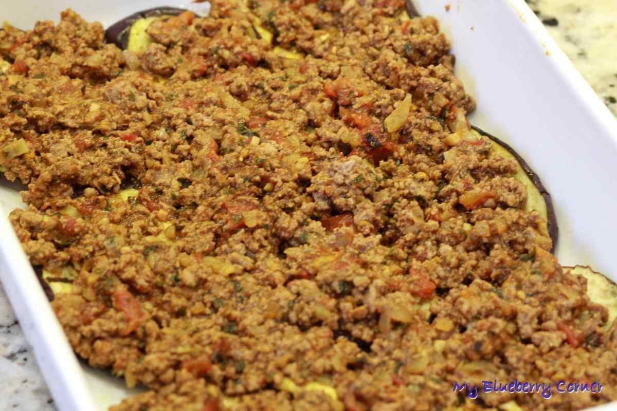 Ponownie ułożyć plastry bakłażana, przykryć pozostałem sosem mięsnym i znów bakłażanami. Na wierzch wylać sos beszamelowy i przysypać pozostałym serem.