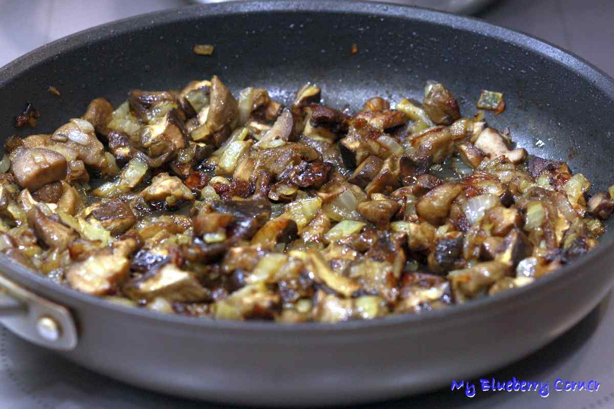 Wyłowić skwarki z tłuszczu, gdy przestygną dodać do mięsa. Grzyby pokroić na drobne kawałki. Dużą cebulę pokroić w średniej wielkości kostkę i przesmażyć na tłuszczu po skwarkach, dodać grzyby.