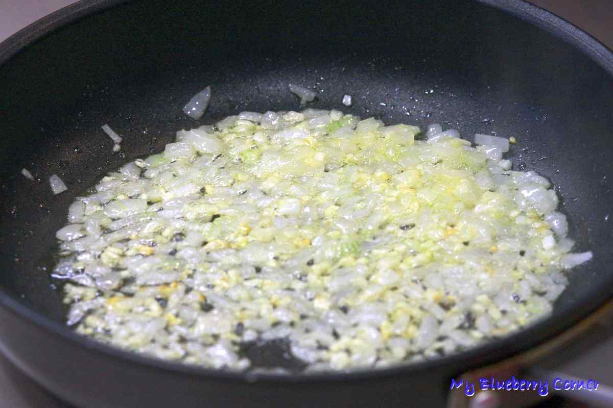Pod koniec gotowania gołąbków przygotować sos. Cebulę i czosnek drobno posiekać. Na patelni rozgrzać klarowane masło. podsmażyć cebulę i czosnek.