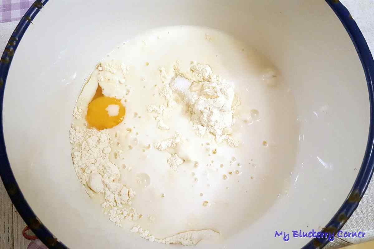 Do miski wsypać mąkę, cukier, szczyptę soli, wbić jajko. Do tego wlać zaczyn i pozostałą maślankę.