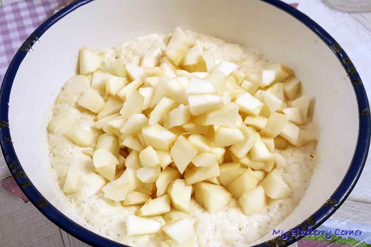 Jabłka obrać, pokroić na drobne cząstki, dodać do ciasta, zamieszać.