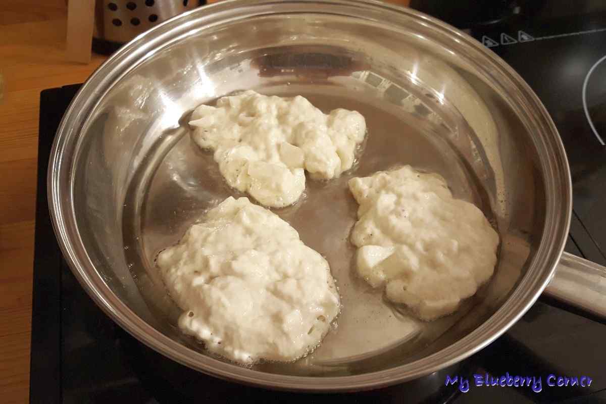 Na patelni rozgrzać olej rzepakowy. Ciasto nabierać mokrą łyżką (za każdym razem łyżkę zamoczyć w kubku z gorącą wodą, wtedy ciasto nie będzie kleiło się do łyżki). Smażyć placki (jedna łyżka – jeden placek) na średnim ogniu, pod przykryciem, z obu stron, na rumiano.