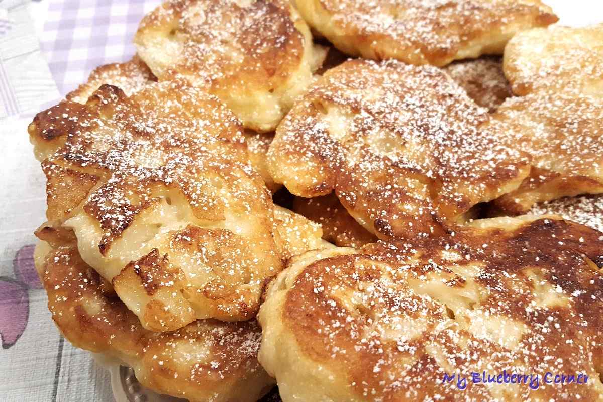 Racuchy z jabłkami podawać gorące, oprószone cukrem pudrem.