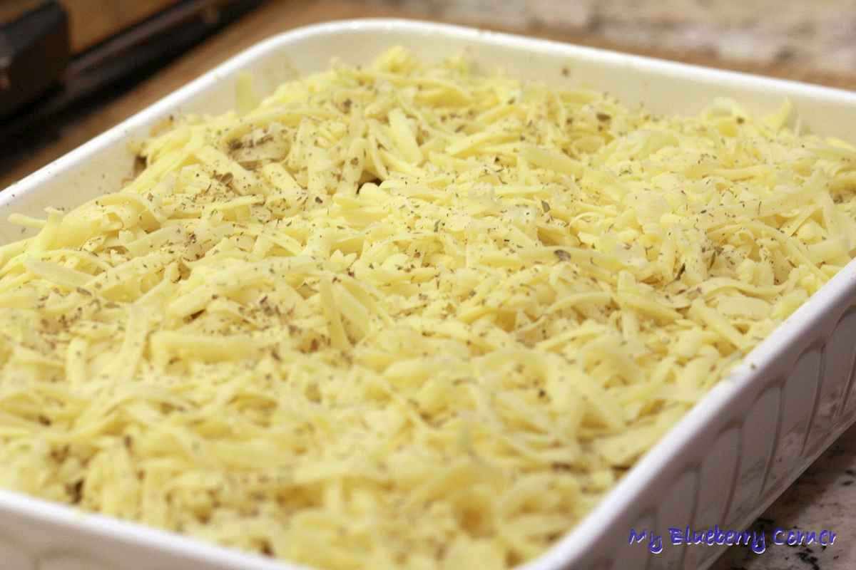 Mozzarellę zetrzeć na tarce o grubych oczkach wysypać na wierzch zapiekanki (można jeszcze sypnąć odrobinę ulubionych ziół – u mnie oregano).