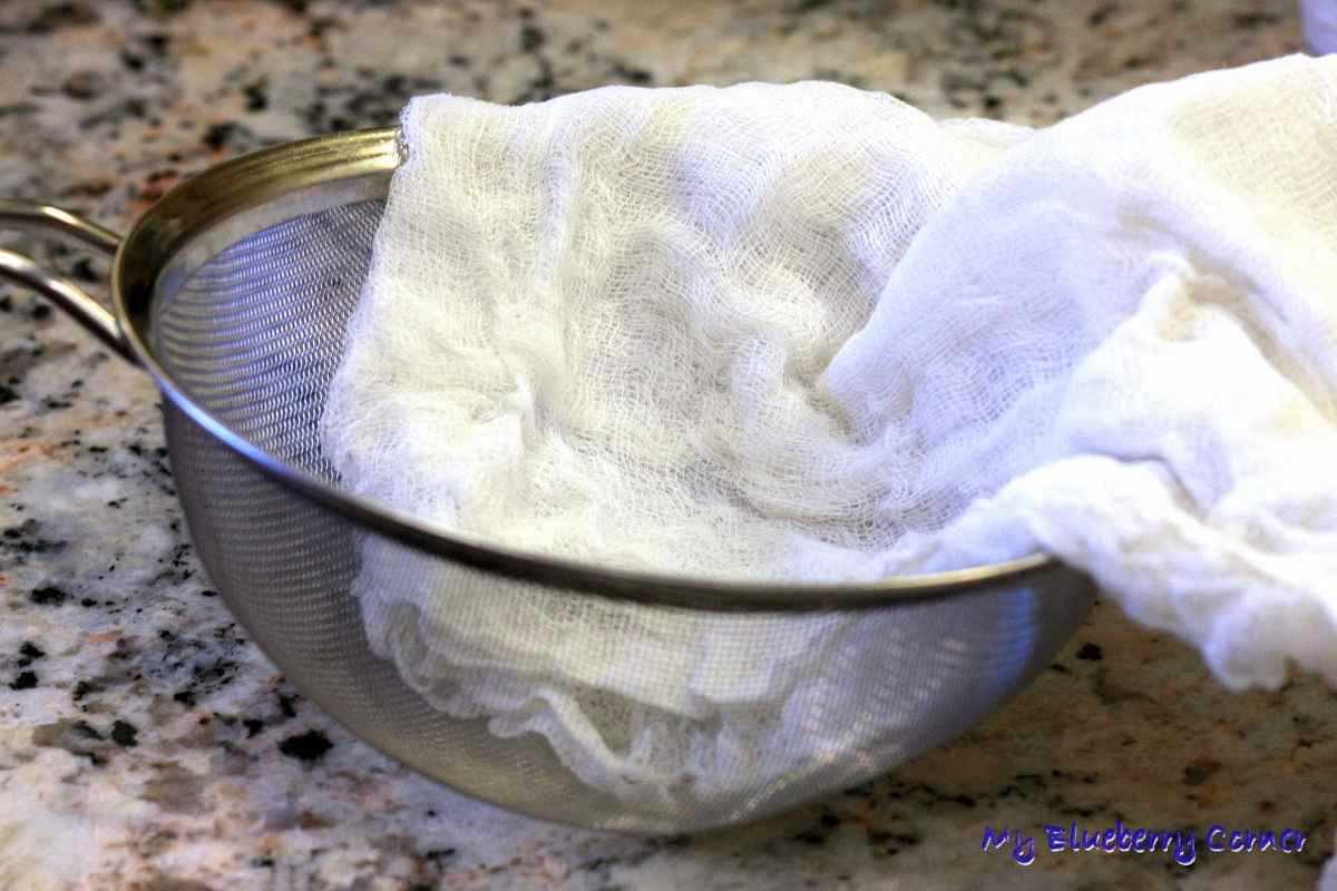 Przełożyć na wyłożone gazą sito. Sito oprzeć na misce przykryć gazą i talerzykiem, obciążyć kamieniem lub innym ciężkim przedmiotem.