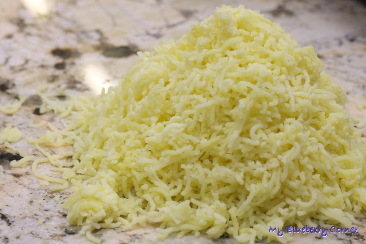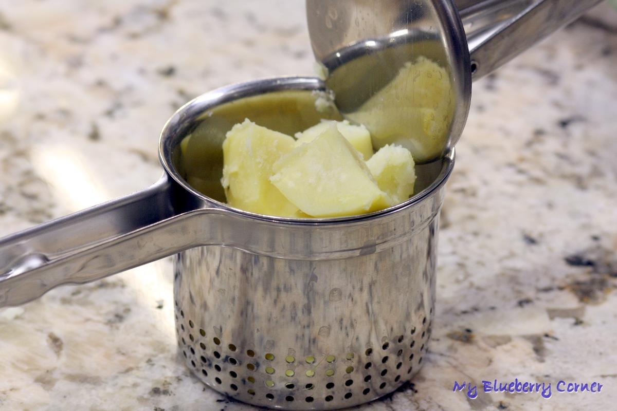 Ugotowane ziemniaki przecisnąć przez praskę prosto na stolnicę lub kamienny blat.