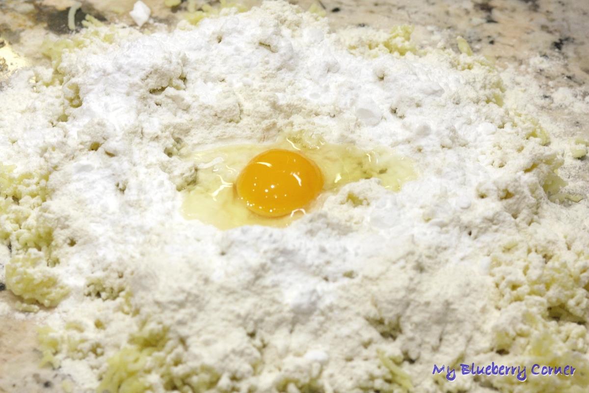 Na to wysypać mąkę pszenną (w zależności od rodzaju ziemniaków, czasem trzeba dodać mąki troszkę więcej) oraz mąkę ziemniaczaną, zrobić na środku dołek i wbić jajko.