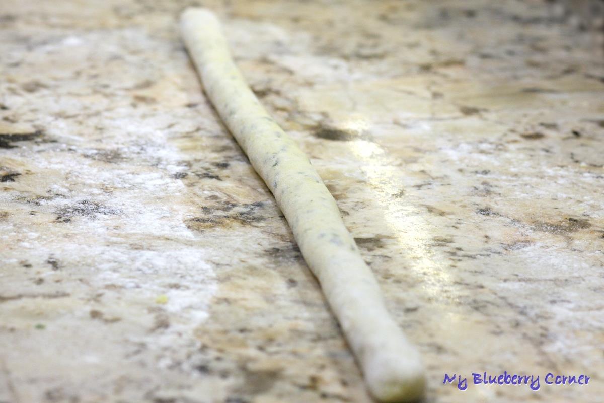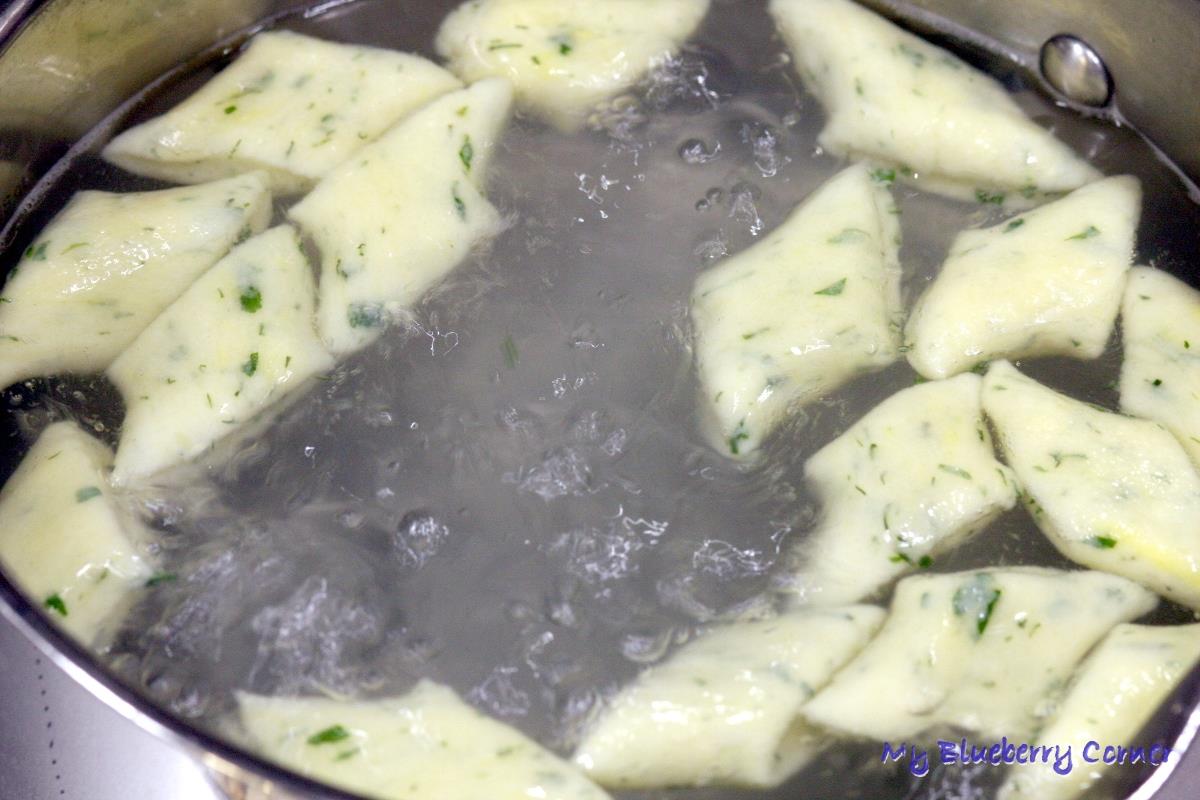Jeśli ciasto wciąż lepi się do dłoni, podsypać odrobinę mąki. Odłożyć. W dużym garnku zagotować wodę, posolić. Ciasto odcinać po kawałku, z każdego kawałka uturlać wałek średnicy ok. 1½ cm. Wałki lekko przygnieść nożem i pociąć na małe romby.
