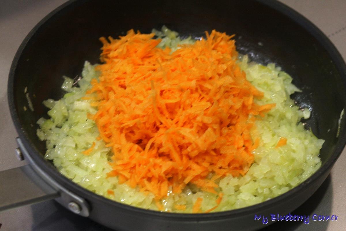 Cebulę obrać i pokroić w ćwierćplasterki. Marchewkę obrać i zetrzeć na tarce o grubych oczkach. Na patelni rozgrzać 2 łyżki oliwy, na tym podsmażyć cebulę. Do zeszklonej cebuli dodać marchewkę, smażyć kilka minut.