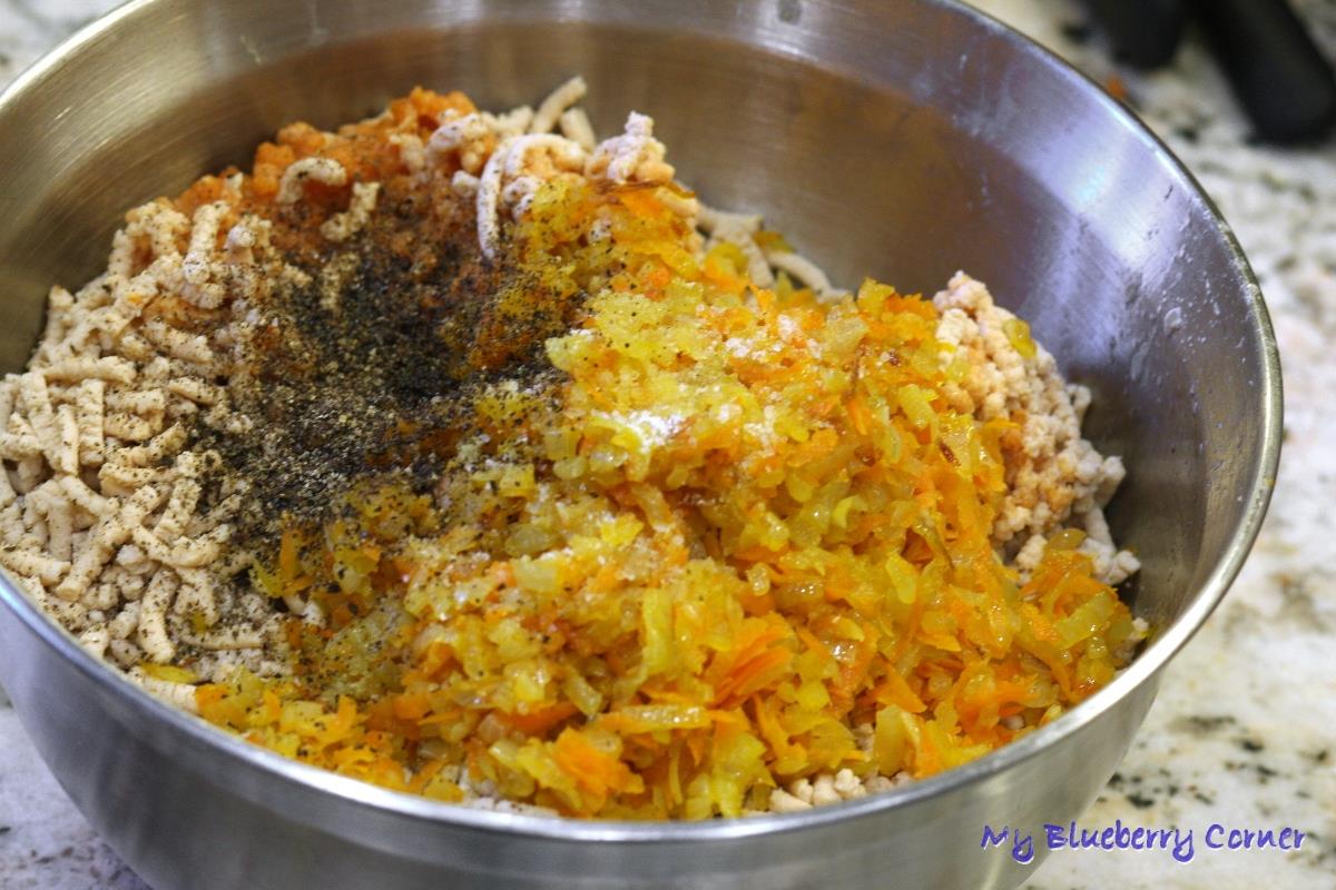 Cebulę z marchewką przełożyć do mięsa, przyprawić solą, pieprzem.