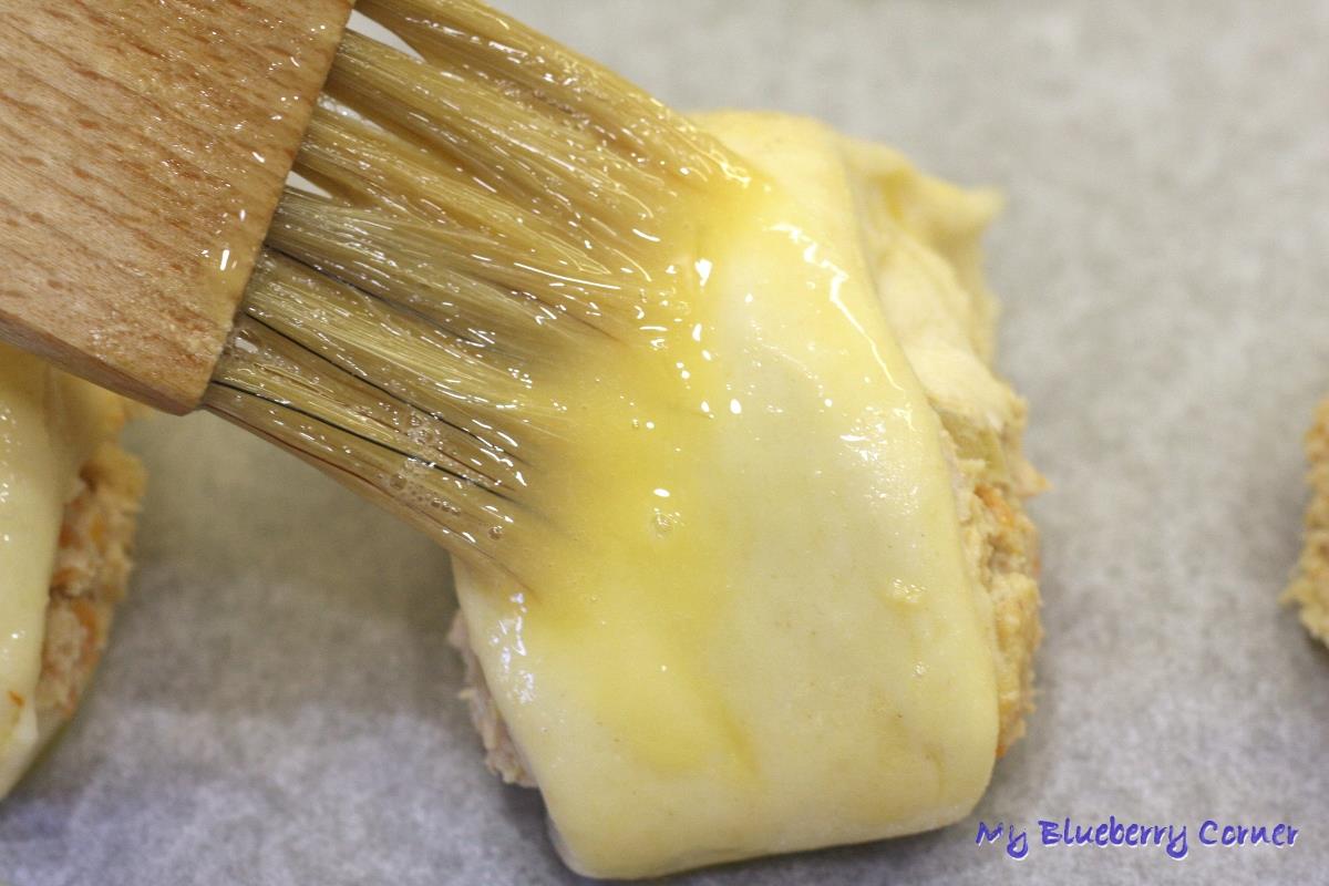 Tak samo postąpić z drugą połową ciasta i farszu. Przed pieczeniem posmarować paszteciki rozbełtanym jajkiem z mlekiem.