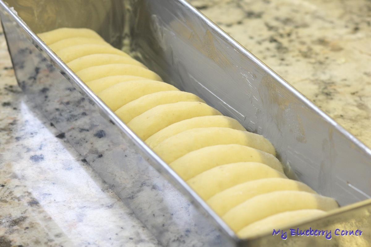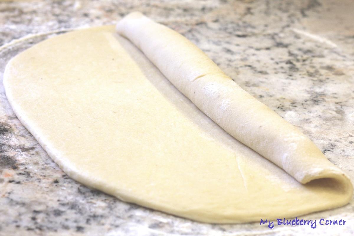 Blachę wysmarować masłem. Ciasto rozwałkować na placek grubości ok. 1 cm i szerokości 30 cm (na długość blachy). Placek zwinąć w roladę i ostrym nożem lub innym narzędziem pociąć ciasto na plastry.