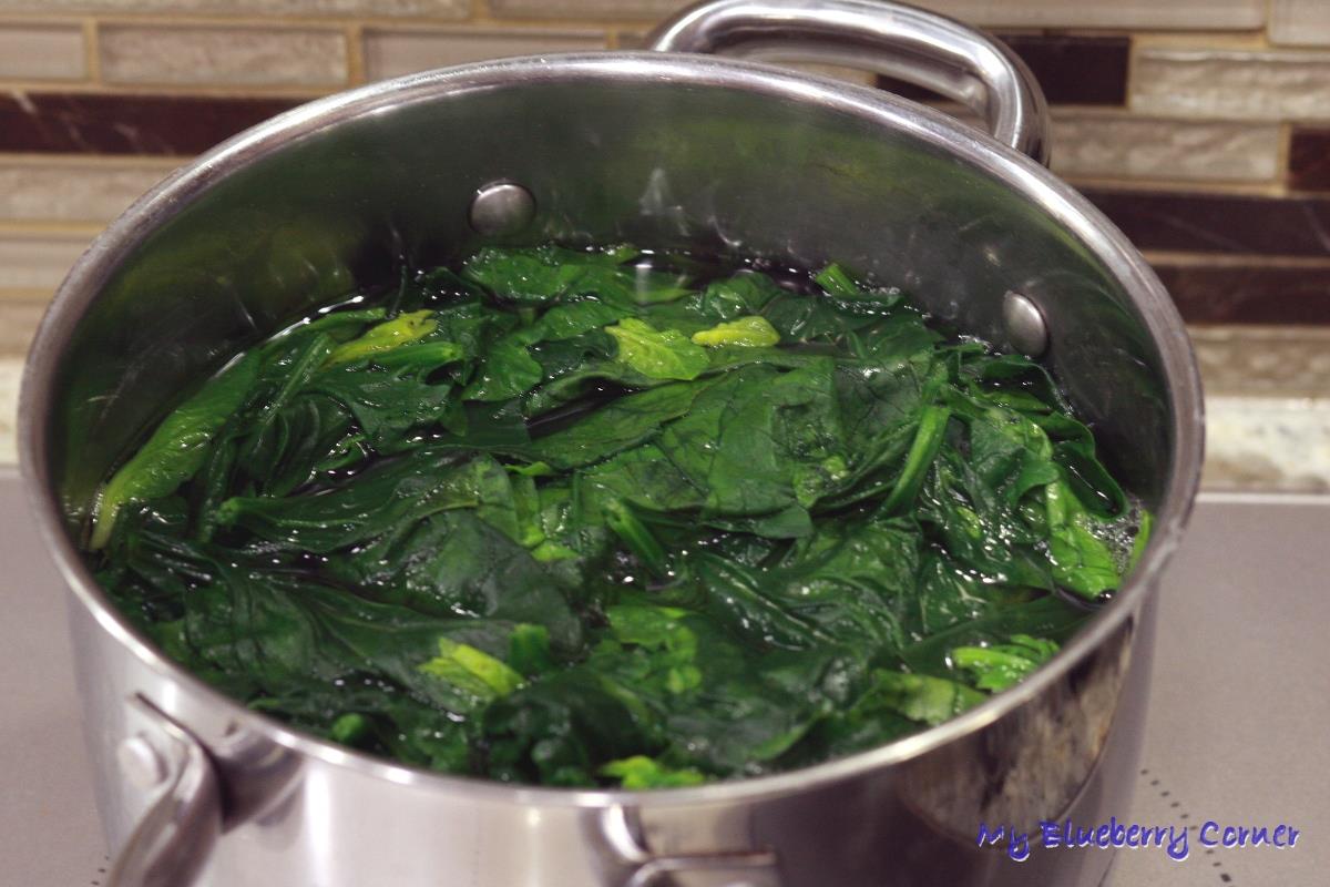 Szpinak oczyścić, odciąć łodygi i ugotować we wrzątku przez 2-3 minuty, odcedzić (zamrożony rozmrozić).