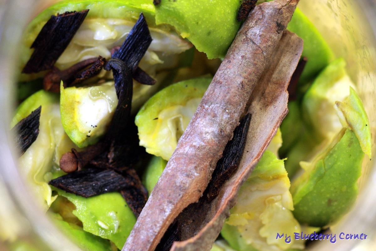 Korzenna nalewka na zielonych, włoskich orzechach to super zdrowy i smaczny trunek. Do tej nalewki potrzebne są zielone, jeszcze nie stwardniałe, lipcowe orzechy włoskie. Ja zrywam je z drzewa, z którego dojrzałych orzechów nie zbieram, bo są twarde jak kamień, chociaż wiewiórki radzą sobie z nimi doskonale. Zielone, lipcowe orzechy zawierają garbniki, olejki eteryczne, witaminy: C, E,  i witaminy z grupy B, mikroelementy, nienasycone kwasy tłuszczowe, flawonoidy oraz jod. Orzechowa nalewka (przygotowana na spirytusie) wzmacnia system nerwowy i bardzo korzystnie wpływa na wygląd i kondycję cery i włosów, obniża poziom cholesterolu w organizmie i działa przeciwzapalnie. Wpływa na korzystnie na problemy żołądkowo-jelitowe, dzięki niej możemy pozbyć się biegunek bakteryjnych i nieżytów przewodu pokarmowego. Dla mnie i moich bliskich nalewka na zielonych orzechach włoskich to doskonałe lekarstwo i tak ją traktujemy. W nagłych sytuacjach kieliszek nalewki potrafi uratować nas przed długotrwałym, złym samopoczuciem. Korzenna nalewka na zielonych, włoskich orzechach oprócz walorów prozdrowotnych ma również doskonały smak.