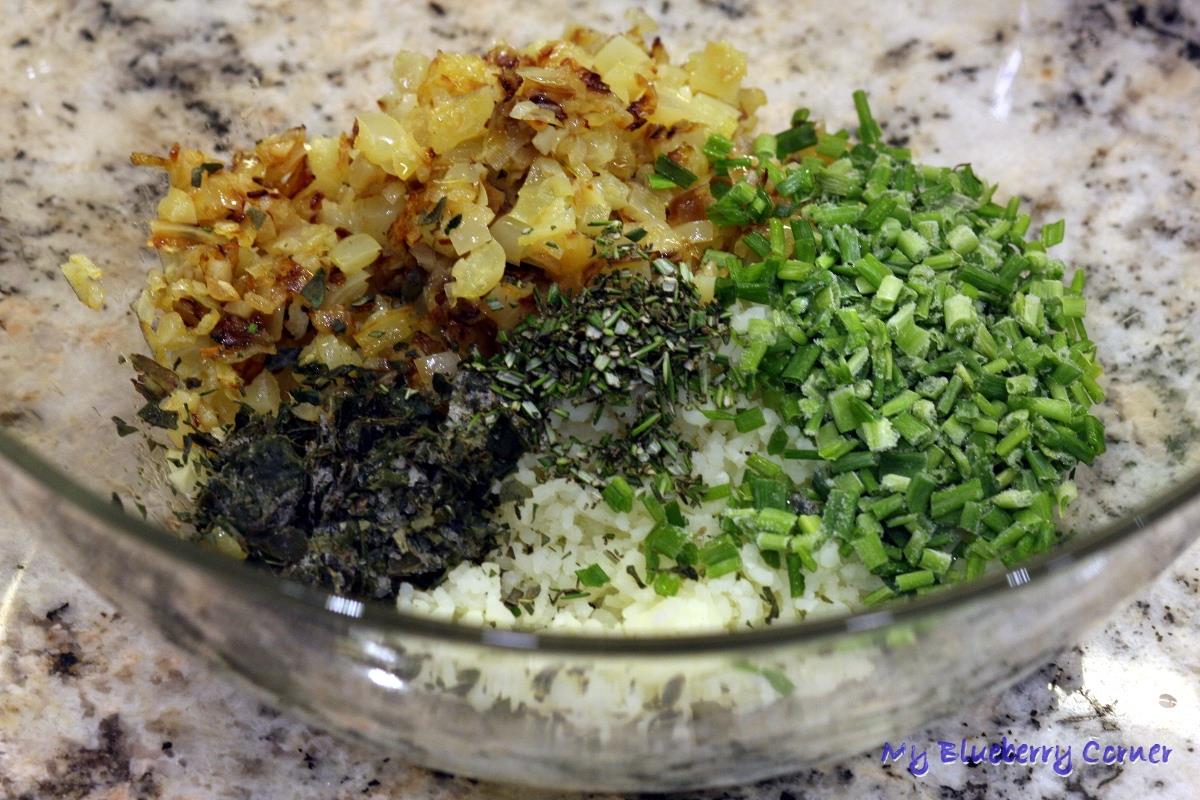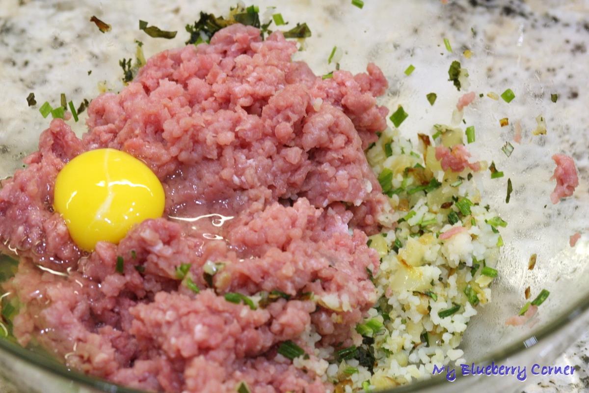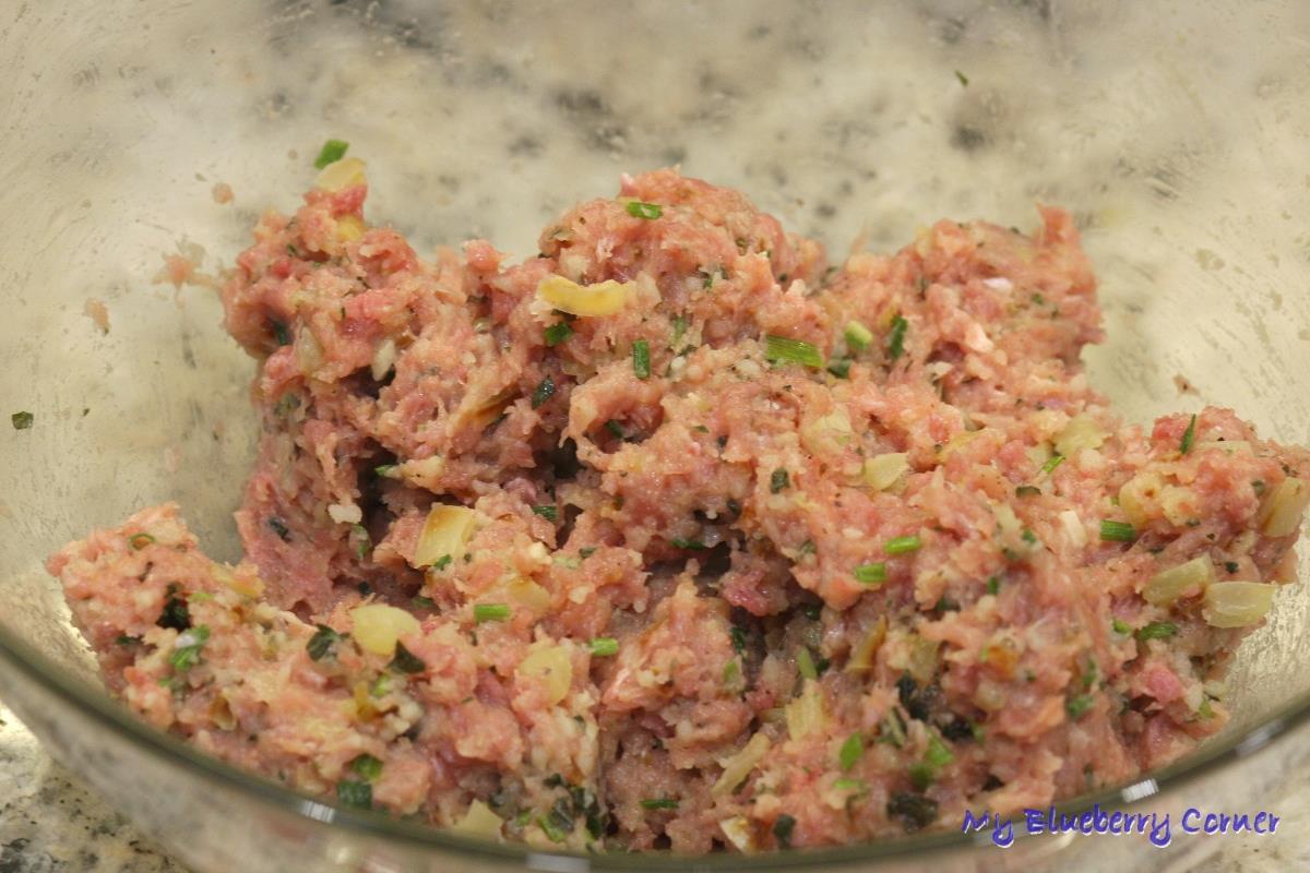 W misce umieścić zmielone mięso, przestudzone ziemniaki i podsmażoną cebulę, czosnek i paprykę. Z rozmarynu usunąć zdrewniałe gałązki, resztę bardzo drobno pokroić, szczypior i bazylię posiekać – wszystkie zioła przełożyć do miski. Dodać jajko, sól i pieprz, wszystko razem wymieszać.