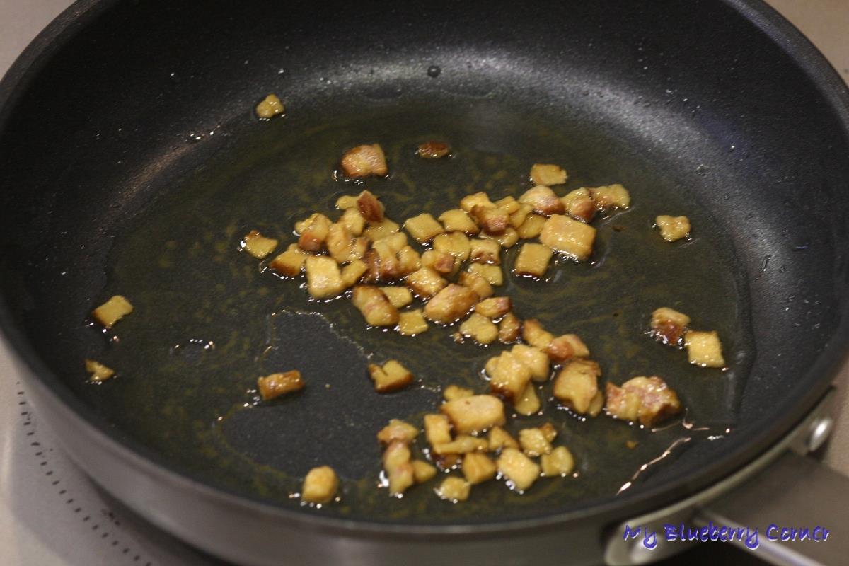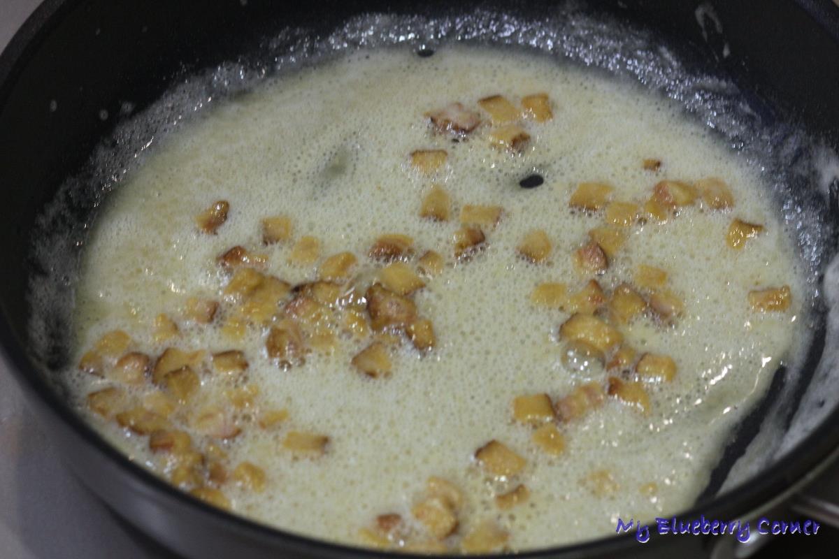 Słoninę pokroić w drobną kostkę, usmażyć aż powstaną chrupiące skwarki. Dodać mąkę, smażyć aż będzie rumiana, przełożyć do rondla, zamieszać wyłączyć.