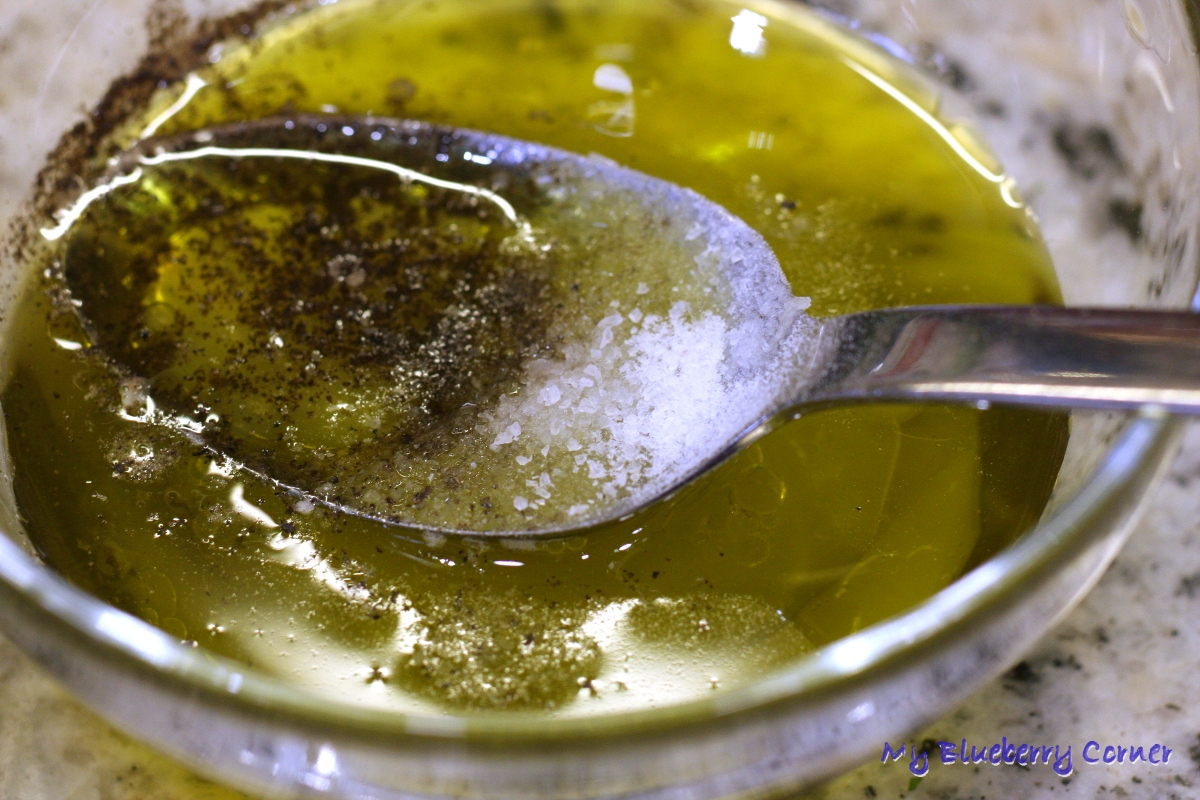 W mniejszym naczyniu wymieszać razem oliwę, sok z cytryny, sól i świeżo zmielony pieprz.