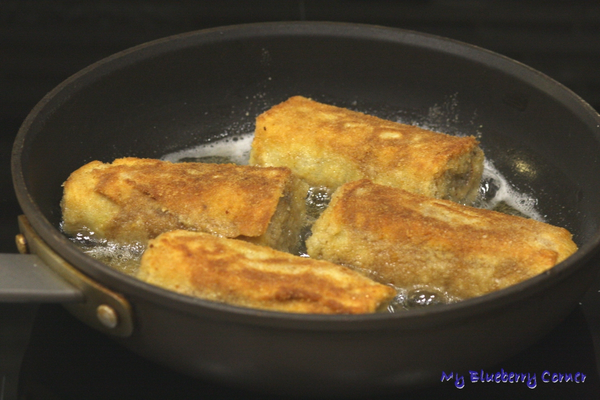 W głębokim talerzu rozmieszać jajko z mlekiem, do drugiego wsypać bułkę tartą. Każdy mały rulon zamoczyć w jajku, obtoczyć w bułce tartej i usmażyć na rumiano na rozgrzanej patelni z olejem rzepakowym.