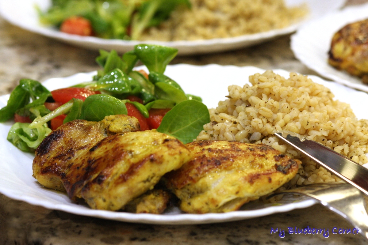 Kurczak po libańsku najlepiej smakuje z kaszą bulgur i prostą sałatką z winegretem, doskonale też komponuje się z sałatką tabouli.