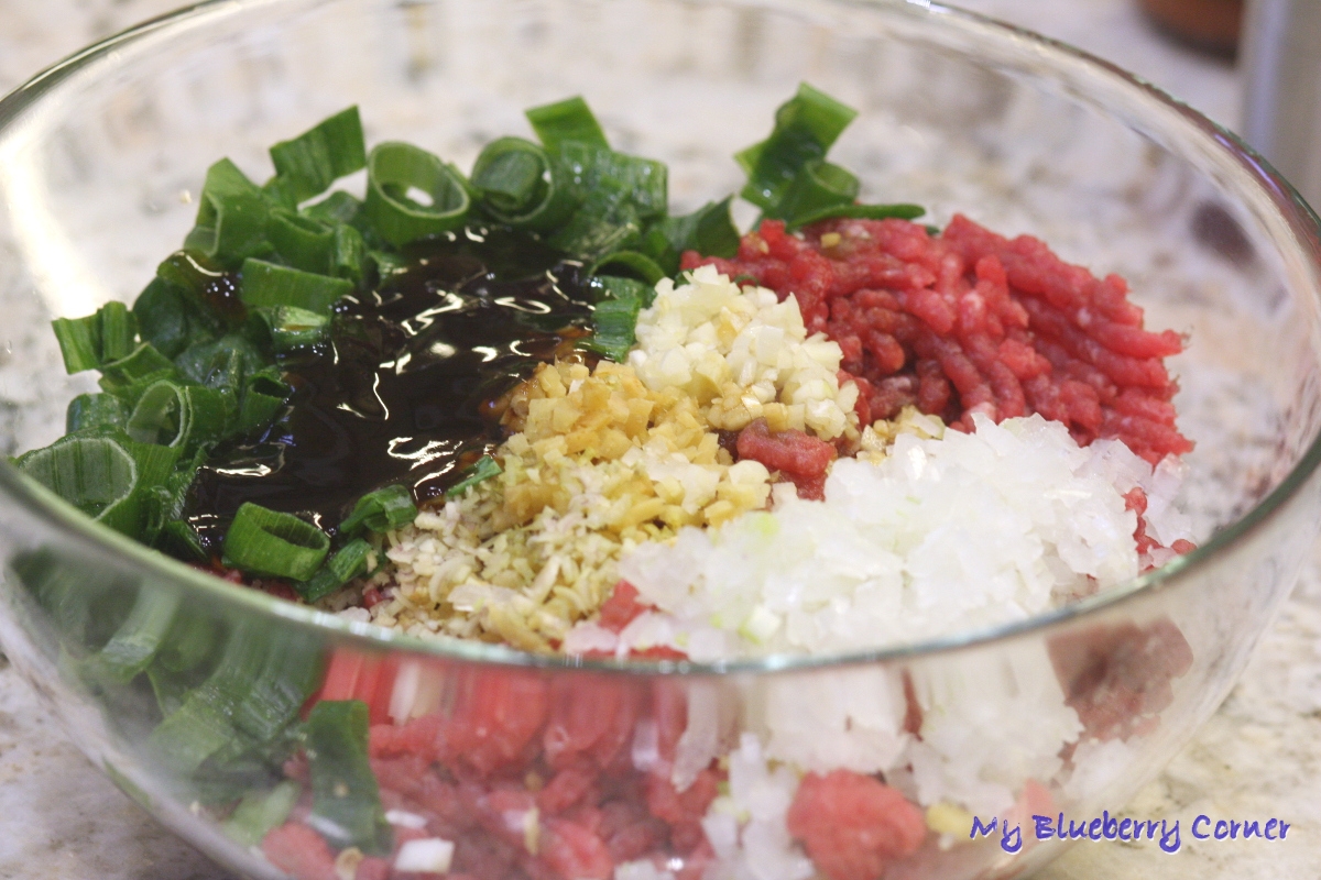 Mieloną wołowinę przełożyć do miski. Imbir, czosnek i cebulkę obrać i drobno posiekać, przełożyć do mięsa. Z trawy odciąć zdrewniałą zieloną część, resztę drobno posiekać. Szczypior i kolendrę pokroić, dodać do mięsa. Dolać sos sojowy, rybny i ostrygowy, wszystko razem połączyć.