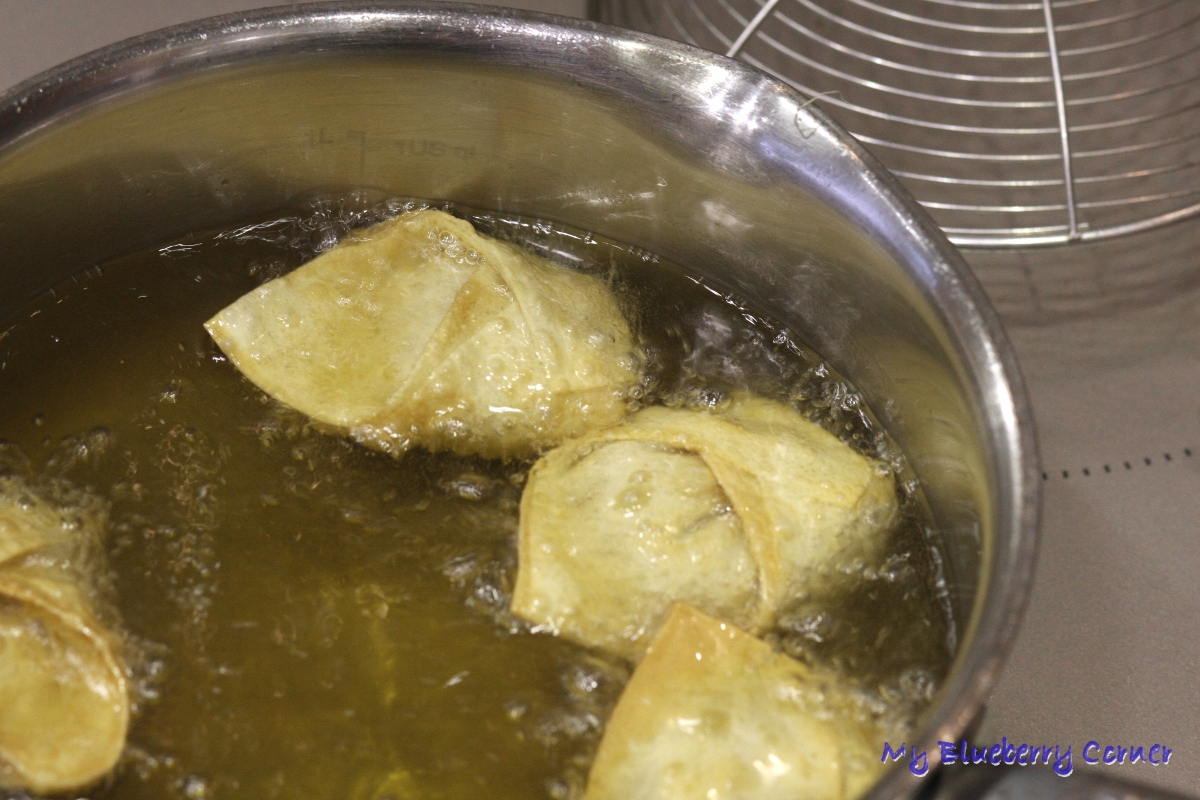 Gdy przygotujemy wszystkie pierożki należy rozgrzać olej. Olej gotowy do smażenia powinien mieć temperaturę ok. 190°C (jeśli nie macie możliwości zmierzenia temperatury oleju, najlepiej jest zrobić test przy pomocy kawałka ciasta, jeśli po wrzuceniu ciasta powstają wokół niego małe bąbelki to olej jest już gotowy na smażenie, olej nie może dymić – wtedy temperatura jest stanowczo za wysoka). Wontony smażyć partiami, po 4-5 pierożków na raz.