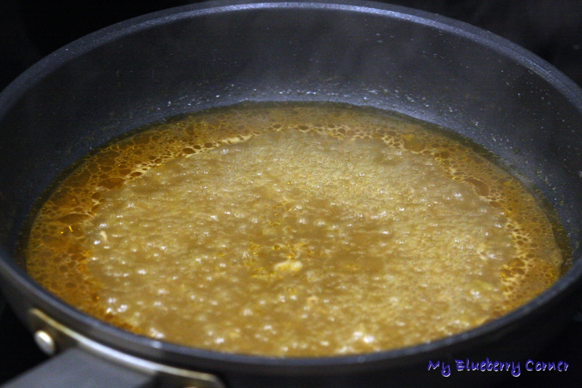 Powstały sos przelać na patelnię, zebrać z wierzchu tłuszcz, resztę zredukować i polać na mięso.