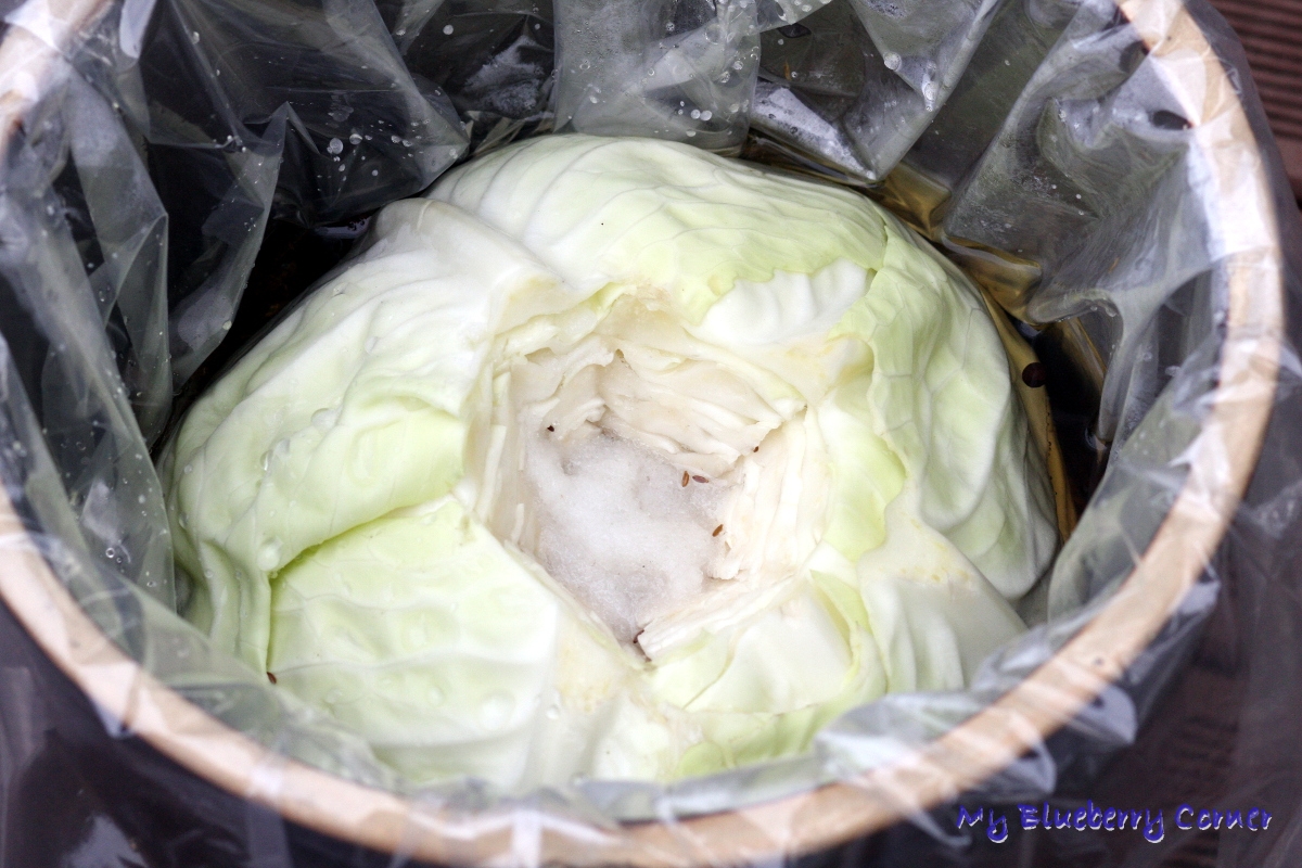 Kapusta kiszona w całości jest doskonała do przygotowania pysznych gołąbków. Potrzebny będzie gliniany lub metalowy garnek, nieduża beczka lub inne naczynie, w którym zmieści się główka kapusty. Naczynie musi być odpowiednio szerokie i wysokie, żeby kapusta mogła być otoczona solanką z każdej strony. Ja użyłam glinianego garnka oraz dodatkowo mocnego worka foliowego, który ogranicza dostęp powietrza do zalewy (dzięki niemu na powierzchni zalewy nie tworzył się tzw. kożuch fermentacyjny i nie musiałam wyparzać kamienia, którym przyciskałam kapustę).