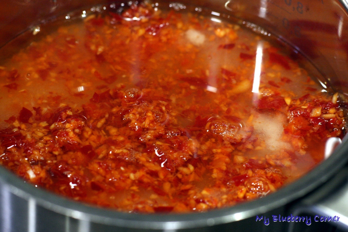 W tym sezonie uprawiałam ostrą paprykę Koral – w skali ostrości Scoville’a ok. 35000 SHU (chociaż niektórzy uważają że jest mniej ostra – ok. 15000 SHU). Nie jestem specjalistką od ostrości i dla mnie papryka Koral jest po prostu bardzo ostra i podobna w ostrości do włoskiej papryki Peperoni. Według skali ostrości Scoville’a papryka Koral plasuje się gdzieś pomiędzy Jalapeño a Cayenne. Przygotowując słodki sos chili trzeba uwzględnić ostrość papryki, mniej ostre papryki jak Jalapeño, Poblano czy Chipotle można dodać wraz z pestkami, bardziej ostre jak Cayenne czy tajska, maleńka Bird’s eye należy zdecydowanie ograniczyć, a żeby zachować kolor i strukturę sosu można dodać startą lub drobno posiekaną marchewkę albo słodką, czerwoną paprykę. Ocet winny czy owocowy można zastąpić octem spirytusowym, ale jego ilość zmniejszyć o połowę i uzupełnić wodą. Tego sosu nie da się zrobić na oko, trzeba się ściśle trzymać przepisu, żeby wyszedł odpowiednio gęsty i pyszny.