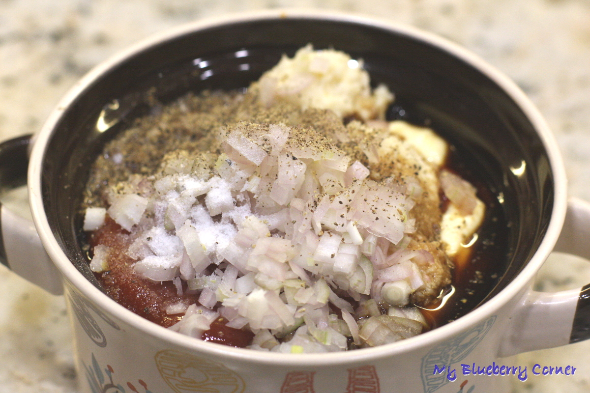 Cebulki obrać, drobno posiekać. W naczyniu umieścić majonez, ketchup, tarty chrzan, ostry sos chili i sos Worcestershire, dodać posiekaną szalotkę oraz sól i pieprz.