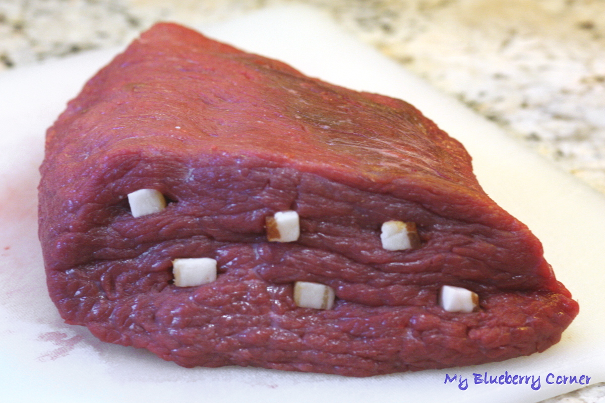 Długim, cienkim, ostrym nożem wykonać nacięcia wzdłuż włókien mięsa i w powstałą przestrzeń wcisnąć zmrożoną słoninę (w naciętą przestrzeń nad nożem można włożyć grubszą pałeczkę lub końcówkę drewnianej łyżki, co zdecydowanie ułatwi wciśnięcie słupka ze słoniny).