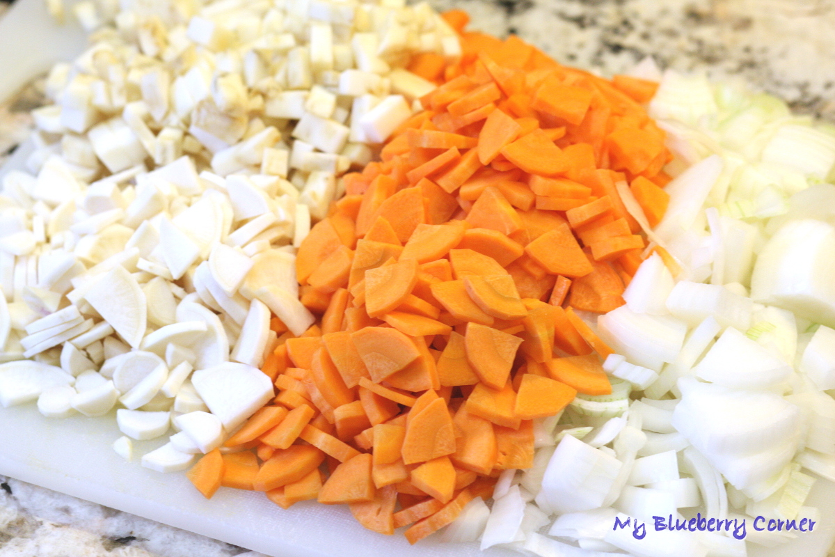 Przygotować warzywa. Cebule obrać, pokroić w ćwierćplasterki lub drobniej, w ten sam sposób pokroić marchewki i pietruszki.
