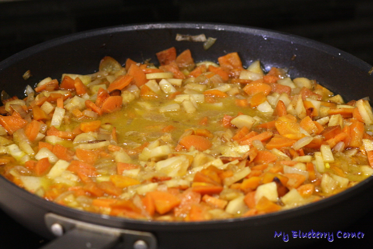 Na tym samym tłuszczu skarmelizować warzywa (przez ok. 10 minut), dodać 1 łyżkę czeskiej musztardy oraz wołowy rosół.