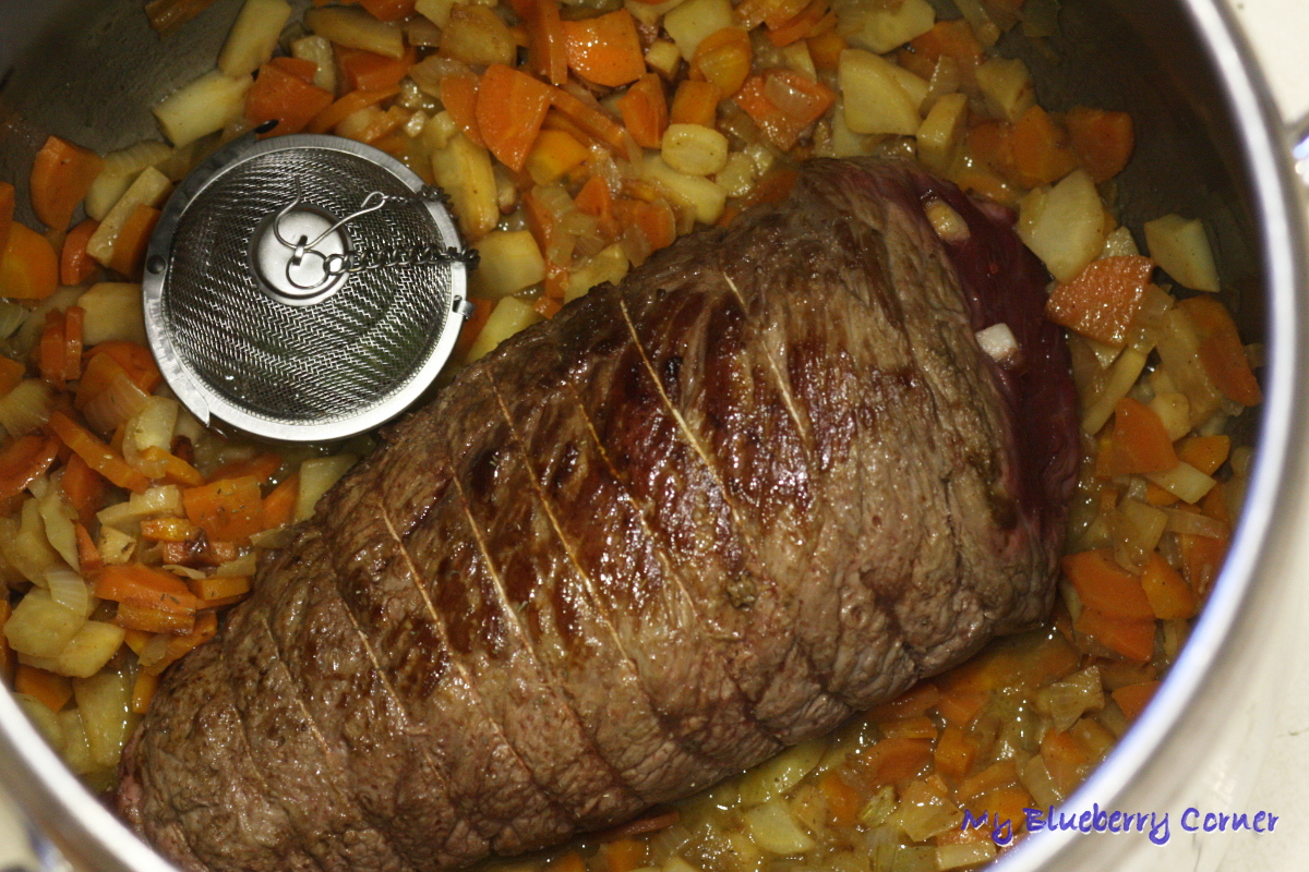 Po ok. 3 minutach warzywa przełożyć do szybkowara lub garnka który można wstawić do piekarnika, po środku ułożyć mięso, dołożyć przyprawy luzem lub w koszyczku.