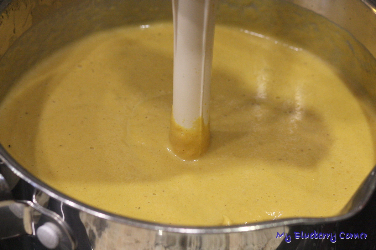 Do pozostawionych w garnku warzyw dolać 150 ml przegotowanej, gorącej wody, 200 ml śmietanki i sól, wszystko razem zblendować na gładko.