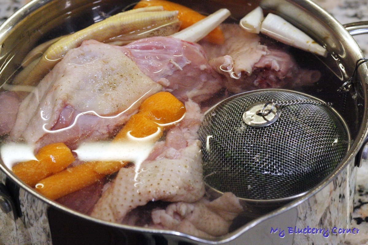 Warzywa obrać. Korpus i podroby z kaczki, marchewki oraz pietruszki włożyć do garnka z wodą. Dodać selera (z łodygą) pora, lubczyk, liście laurowe, ziele angielskie oraz ziarenka pieprzu (ja do przypraw i włoszczyzny używam stalowego koszyka, który ułatwia późniejsze pozbycie się ich z zupy).