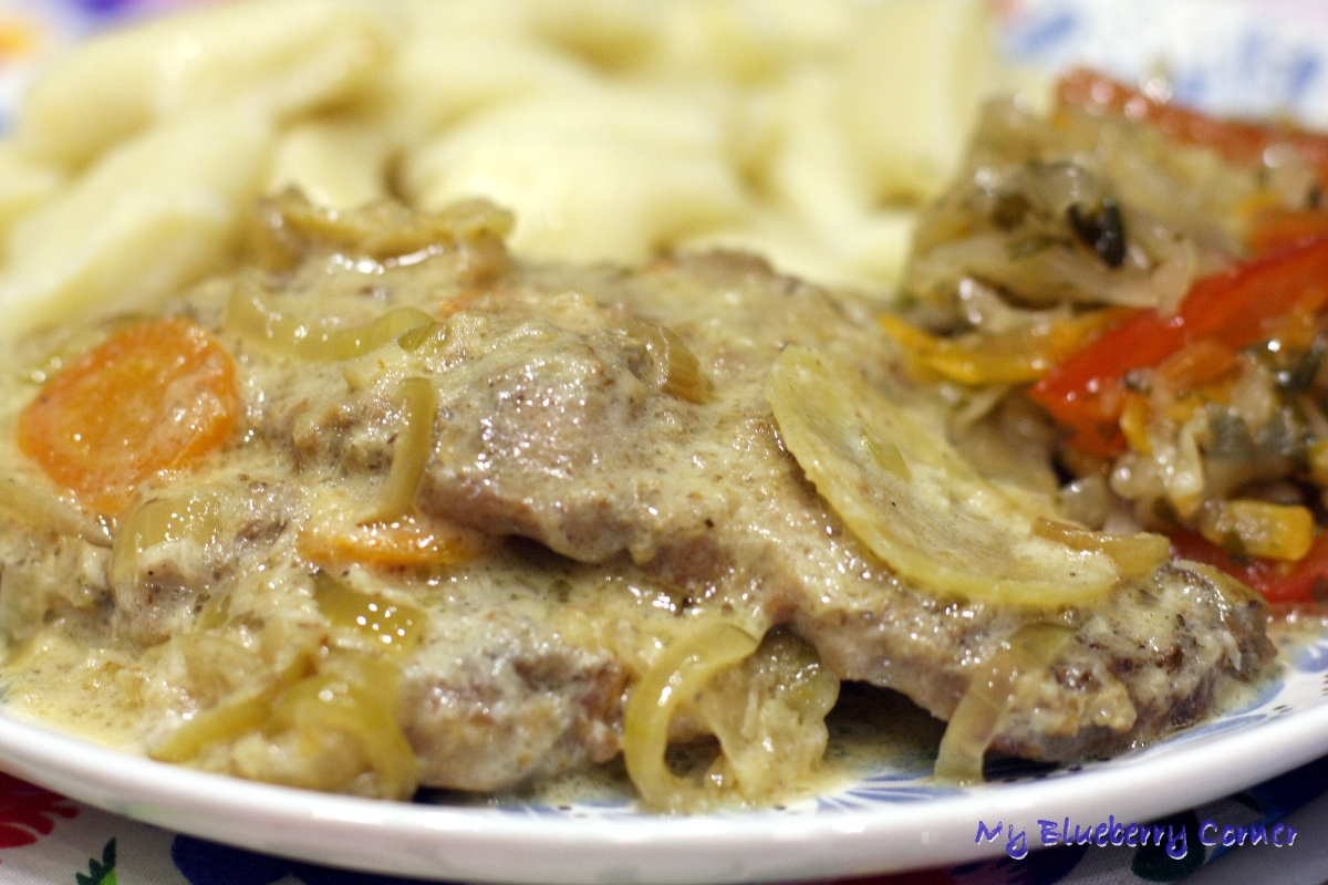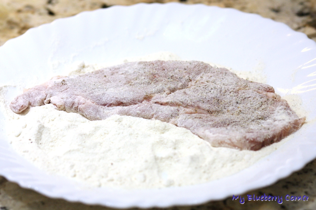 Na patelni rozgrzać olej, mąkę wysypać na duży talerz. Każdy kawałek mięsa obtoczyć w mące, przełożyć na patelnię i usmażyć na rumiano z obu stron. Po usmażeniu wszystkie plastry karkówki przełożyć do wolnowaru lub garnka z grubym dnem.