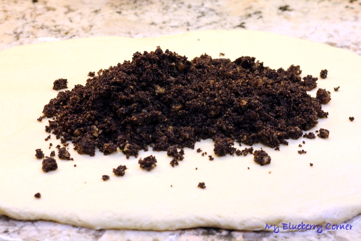 Na ciasto w miarę równomiernie wysypać makową masę.