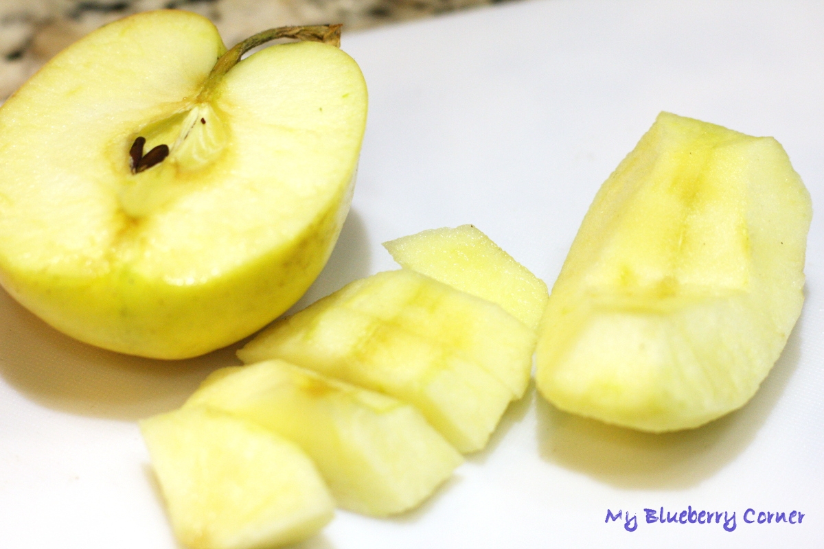 Jabłko obrać, usunąć gniazdo nasienne, podzielić na mniejsze kawałki (jak na zdjęciu).