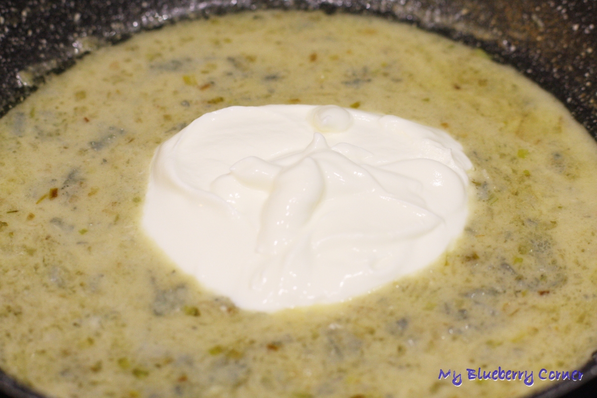 Gdy ser zacznie się rozpuszczać dodać wino, zamieszać dodać śmietanę. Zamieszać, przykryć pokrywką, zmniejszyć temperaturę do minimum.
