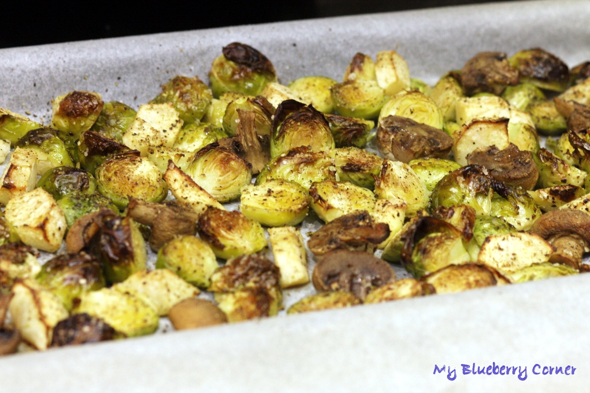 Piekarnik rozgrzać do 220°C w termoobiegu. Brukselkę, pieczarki i cząstki jabłka razem wymieszać, rozłożyć równomiernie na wyłożonej papierem do pieczenia blasze. Warzywa skropić oliwą, doprawić solą i grubo zmielonym pieprzem, wstawić do piekarnika, piec przez 30 minut.