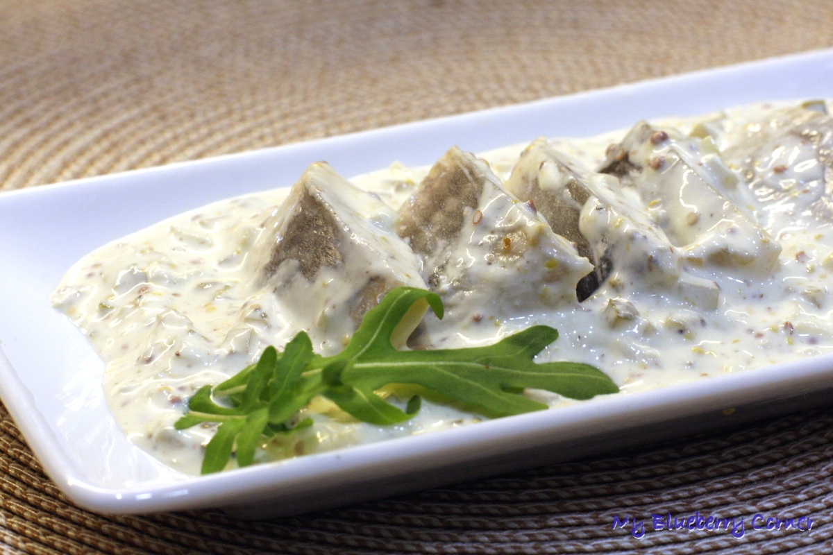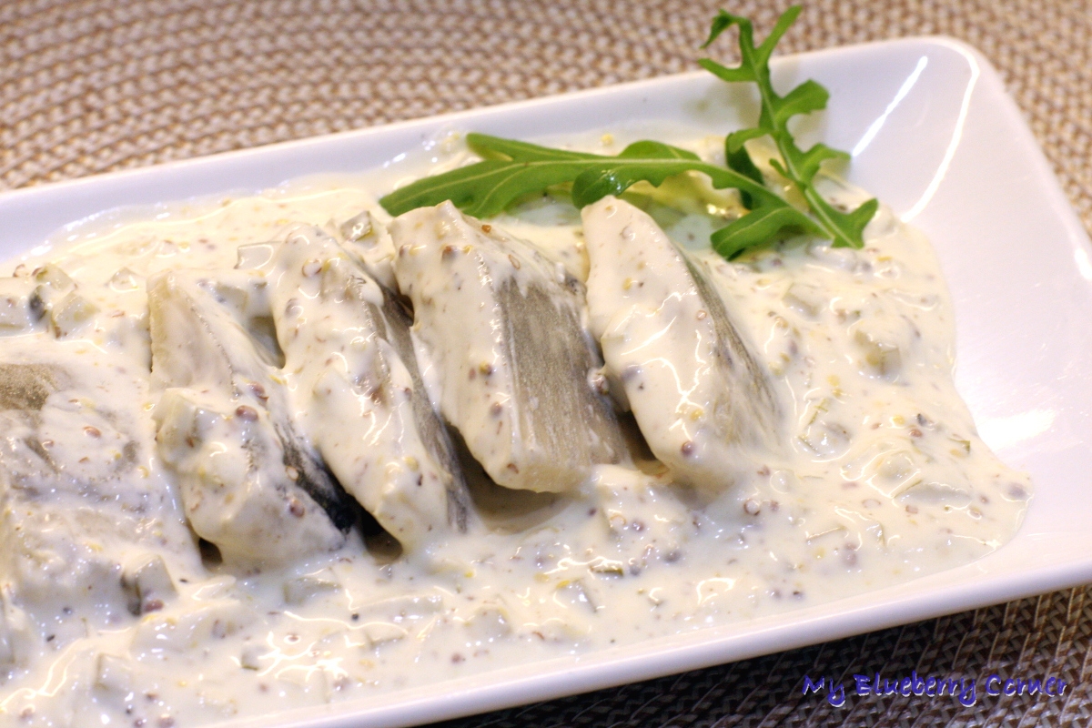 Płaty śledziowe pokroić na 1½ – 2 cm paski, dodać do sosu, wymieszać.