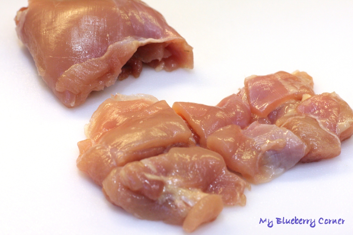 Mięso z kurczaka pokroić na kawałki wielkości kęsa.