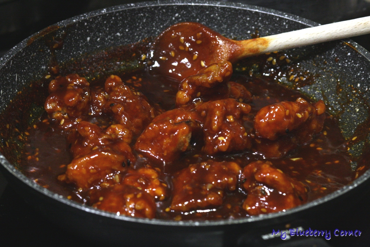 Podgrzać sos, usmażone kawałki kurczaka przełożyć do sosu, dobrze wymieszać, aż będą równomiernie pokryte.