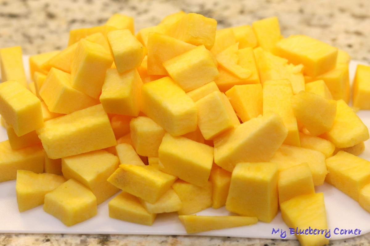 Dynię obrać ze skóry, wewnętrze oczyścić z pestek, miąższ pokroić na kostkę ok. 1½ – 2 cm .