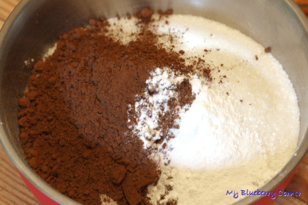 Piekarnik rozgrzać do temperatury 180°C. W misie wymieszać razem maślankę, olej i jajko. W drugim naczyniu wymieszać wszystkie sypkie składniki – mąkę, proszek do pieczenia, cukier i kakao.