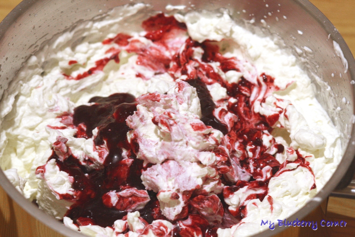 Do napęczniałej żelatyny dodać 4-5 łyżek gorących owoców, wymieszać. Teraz rozpuszczoną żelatynę przełożyć do gorącego, porzeczkowego musu, porządnie zamieszać. Mus odstawić do całkowitego ostygnięcia. Śmietanę ubić na sztywno, ciągle mieszając (powoli) dodawać po 1 łyżce sera mascarpone, aż powstanie puszysty, gęsty krem. Do kremu dodawać po łyżce wystudzonego musu, mieszać łyżką aż wszystko będzie równo połączone.