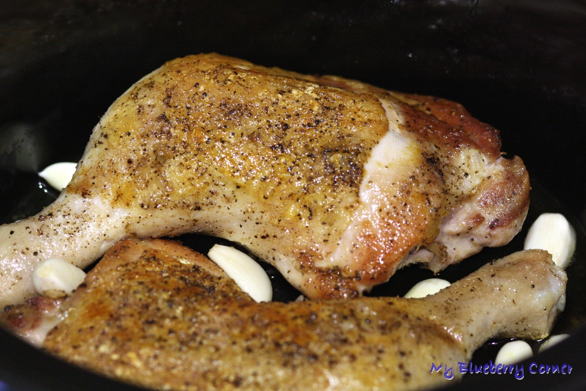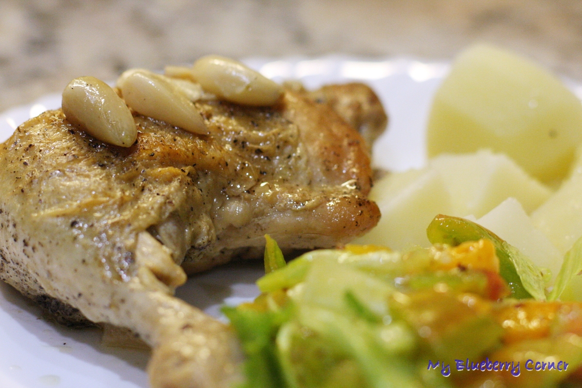 Nogi kurczaka z wolnowaru z gotowanymi ziemniakami i sałatą z czosnkowym winegretem to bardzo smaczne danie – jednocześnie proste i wykwintne. Wolno gotowane mięso jest delikatne, łatwo odchodzi od kości i świetnie komponuje się wyżej wymienionymi dodatkami. Ząbki czosnku dopełniają i podnoszą smak na jeszcze wyższy poziom. Czosnek w tym daniu jest łagodny, delikatny, pyszny. Gdy mam więcej czasu często wybieram potrawy z wolnowaru – są zdrowsze i smaczniejsze.
